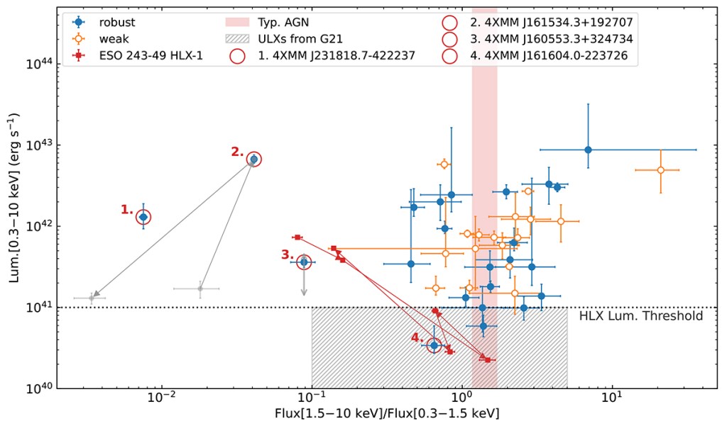 However, HLXs are predominantly found in distant galaxies (d ≳ 100 Mpc), where the chances of source confusion and misidentification with active galactic nuclei (AGNs) or other transient X-ray phenomena are high. Aims. Our goal is to produce a clean sample of HLXs, by removing possible contaminants, and to characterise the spectral properties of the remaining population. This sample can then be used to determine whether different types of astrophysical objects coexist within the same class. Methods. Starting with a set of 115 HLXs detected by XMM-Newton, we identified and removed contaminants (AGNs, X-ray diffuse emission detected as point-like, and tidal disruption event candidates) and retrieved 40 sources for which XMM-Newton spectra are available. We fit them with an absorbed power law model and determined their unabsorbed luminosities and hardness ratios. We constructed the hardness-luminosity diagram and compared the results with the spectral properties of the HLX prototype, ESO 243-49 HLX-1. Then we conducted a deeper analysis on a selection of promising candidates. Results. The resulting HLX population spans a luminosity range from 1 × 1041 erg s‑1 to nearly 1043 erg s‑1 and is homogeneously spread in hardness between 0.5 and 5. Half of the population display hardness ratios higher than a typical AGN and could be considered an extension of the ULX population at higher energies. We found four very soft outliers, which are characterised by steep power law spectra and no X-ray emission above 1–2 keV, similarly to ESO 243-49 HLX-1. Those with multi-epoch archival data display changes in luminosity of up to nearly two orders in magnitude. Conclusions. We show that sources currently identified as HLXs can be more diverse than ULXs and disentangling among these different types of objects is not trivial with the data currently available. New observations would be beneficial to expand the current sample and uncover the true nature of many objects of this class, some of which show very similar characteristics to ESO 243-49 HLX-1.