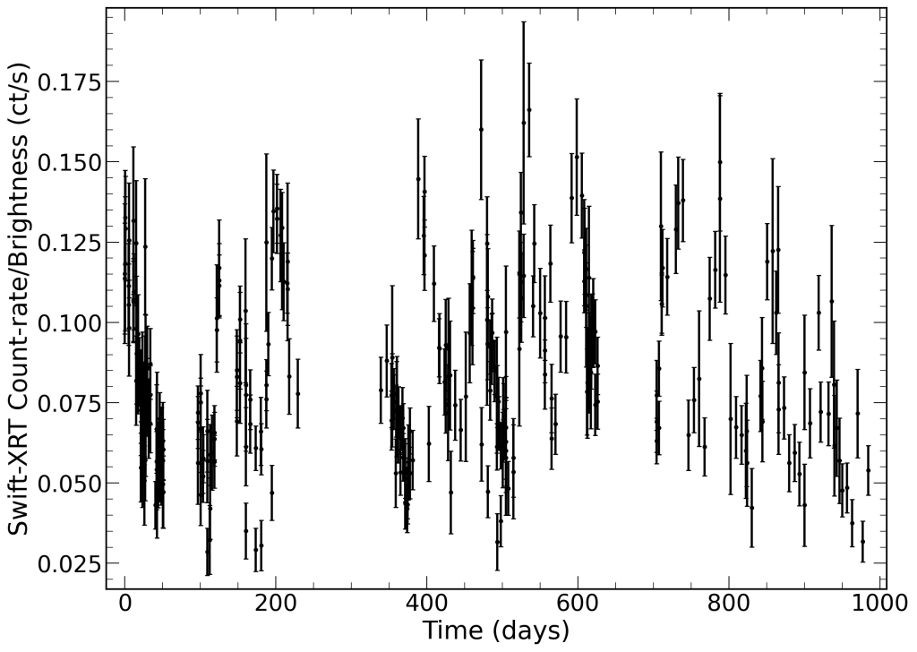 This binary system had been monitored by NASA’s Swift X-ray Telescope. I wanted to determine whether the observed variability in the ‘lightcurve’ — how the amount of received photons from a given system varies over time — of this system was periodic (i.e. repeating in a predictable manner) or ‘random’.