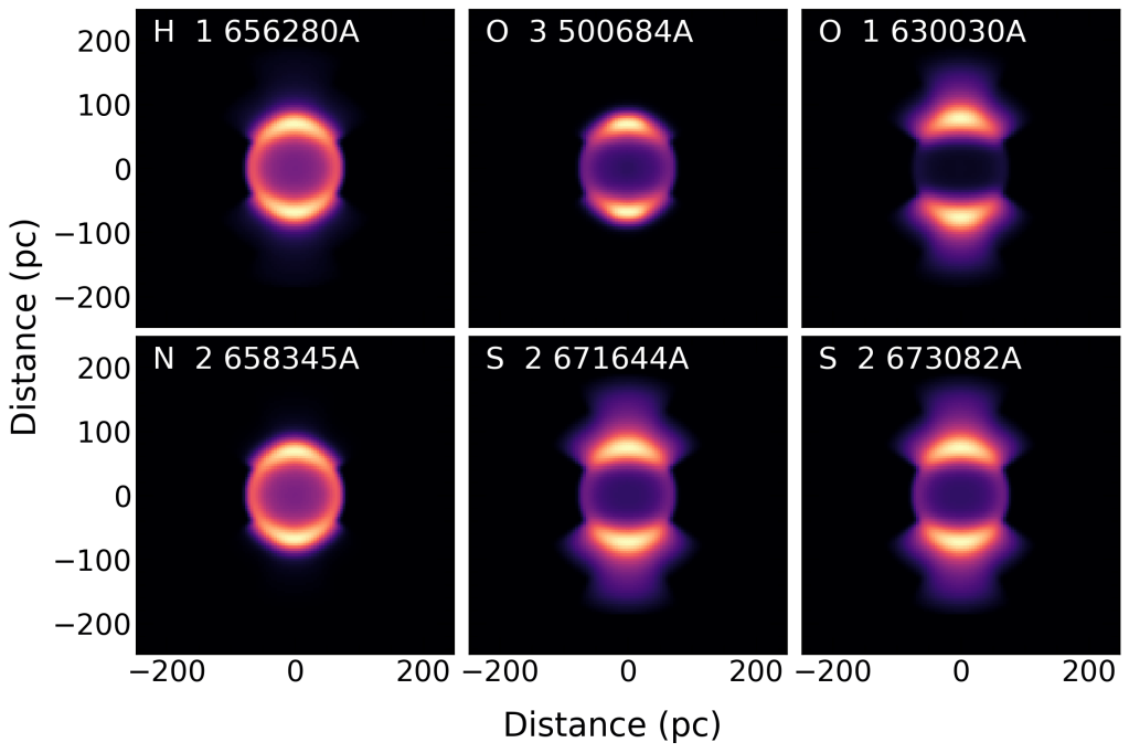 At the moment, I am trying to quantify how much radiative energy is released in the environment by these mighty accretors. To do that, I’m investigating how the interstellar medium would “glow” in various atomic transitions when irradiated by the accretion disk of a ULX by producing maps as the one below. The idea is then compare these simulated, nebular models to observations of actual nebulae to try to constrain what accretion disk model from the ULX best matches the data. For more details, have a look at this entry of my blog.