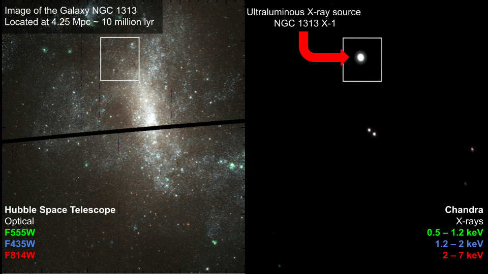 To do that, on the one hand I use data from space-borne observatories in X-rays, such as the European Space Agency’s X-ray Multi-Mirror-Newton, NASA’s NuSTAR and the Chandra X-ray observatory, and in the IR/optical and UV, such as the Hubble Space Telescope, to study the light emanating directly from the accretion disk in ULXs to understand their nature.